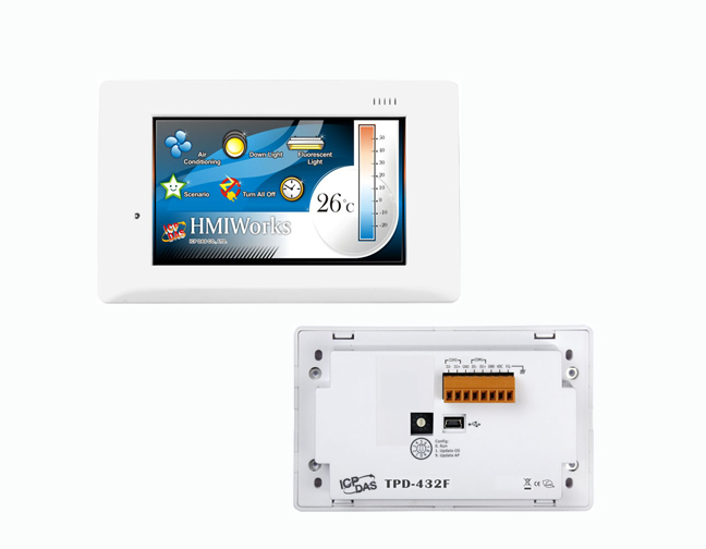 The TPD-432F TouchPAD is a tiny touch HMI and is designed for building and home automation. TPD-432F is equipped with high resolution TFT color touch screen and can be used to replace regular electrical wall-mount outlets. It is seamlessly integrated with rich I/O modules and presents a beautiful, flexible, and user-defined picture frame. In short, it is the best choice to upgrade a mechanical switch to intelligent control pads.