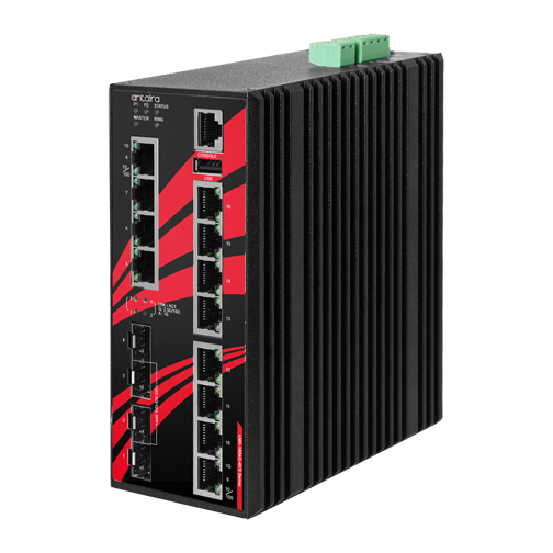 Antaira Technologies’ LMX-1604G-4XS is an 16-port managed Gigabit Ethernet switch embedded with 12*10/100/1000T Ethernet ports and 4*1G/2.5G/10G SFP+ slots for fiber connection. It is a fully manageable light layer 3 Ethernet switch that is pre-loaded with a user-friendly web management console design. It supports the ring network redundancy function using the market’s open standard ITU-T G.8032 Ethernet Ring Protection Switch (ERPS) protocol that has a <50ms network recovery time. The advanced network filtering and security functions, such as IGMP, VLAN, QoS, SNMP, RMON, Modbus TCP, and 802.1X/HTTPS/SSH/SSL increase determinism and improve network management for remote SCADA systems or control networks.