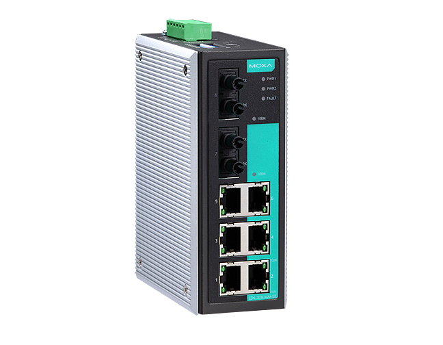 Moxa EDS-308-MM-ST-T - Industrial Unmanaged Ethernet Switch with 6 10/100BaseT(X) ports, 2 multi mode 100BaseFX ports, ST connec