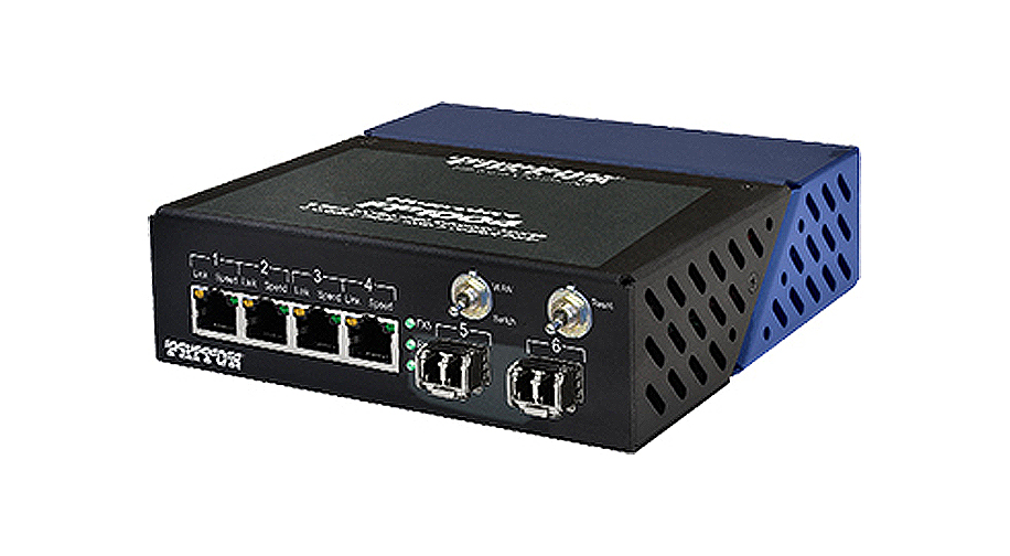 The Patton Model FP1004E-EUI is a powerful 6-port 10/100/1000 Light Industrial Ethernet switch. The unit features (4) RJ-45 UTP ports as well as (2) flexible SFP ports. Two or more FP1004E can be chained together via fiber to provide a distributed solution where isolation, distance, security and/or noise immunity is needed between nodes.