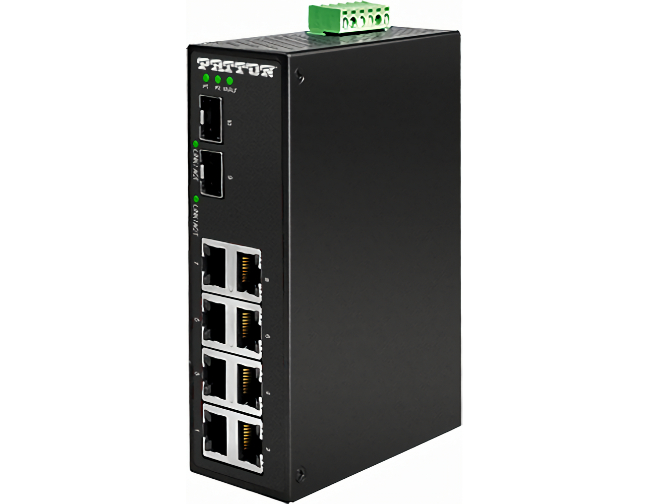 Patton FP1008E/2SFP/DC – Unmanaged Industrial Gigabit Ethernet Switch; 8 x 10/100/1000 (RJ45); 2 x GigE SFP; -40 to 75°C; 12-