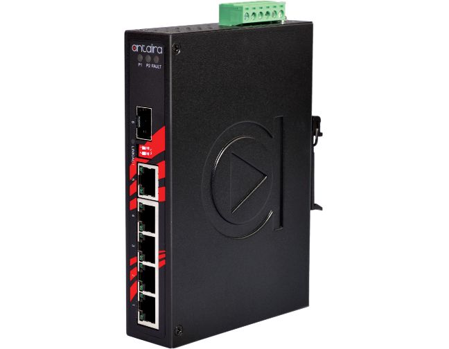 Antaira's LNX-0601G-SFP-T are IP30 rated and DIN-Rail mountable. The unit is designed with five gigabit Ethernet ports and one dual rate (100/1000) SFP slot, making it ideal for applications that demand high bandwidth and long distance communication.The LNX-0601G-SFP-T series provides high EFT and ESD protection to prevent any unregulated voltage and is suitable for harsh environments. It supports the power redundancy feature using a dual power input design with reverse polarity protection. In addition, the built-in relay warning function alerts maintainers when power failures or port breaks occur. Also, the built-in advanced broadcast storm protection feature will block any data packet that exceeds a defined limit when it arrives to a port, until the rate decreases to a lower threshold. The LNX-0601G-SFP-T has an extended operating temperature range of -40 to 75C. It is a perfectly designed product to fulfill any special needs of industrial automation, outdoor applications and harsh weather enviornments.