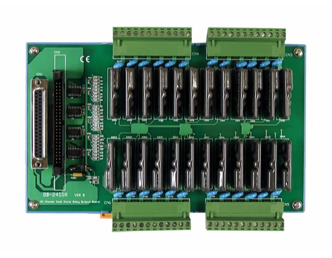 The DB-24SSRDC includes 24 normally open, or form A, solid-state relays The board interface to filed logic signals, eliminating ground-loop problems and isolating the host computer from damaging voltages. The user can use the DB-24SSRDC to switch high voltage load, up to 240 VAC/50 VDC and up to 4A. The relay is energized by applying a 5-voltage signal to the appropriate relay channel on the 50-pin header or 37-pin D-sub connector. Twenty-four enunciator LEDs, one for each relay, light when their associated relay is activated. Because there is a D-sub 37-pin connector on the board, the user may use it to interface to any TTL output board. In other words, the user may use it as a general purpose solid state relay output board.