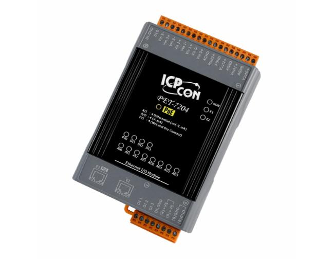 ICP DAS PET-7204 - PoE Ethernet I/O Module with 2-port Ethernet Switch, with 4-channels AI, 4-channels AO, 4-channels DI (RoHS) by ICP DAS