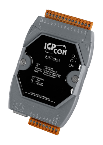 The ET-7083/PET-7083/ET-7283/PET-7283 is a 3-axis high speed encoder/counter module. Its each axis can be individually configured for Quadrant, Pulse/Direction or CW/CCW counting modes. The maximum input rate for Quadrant counting mode is 1 MHz, and for Pulse/Direction, CW/CCW counting modes is 4 MHz. The encoder/counter module is equipped a FRAM to retain the counter value after it is powered off. FRAM is a nonvolatile memory that can hold written data even after it is powered off. The data retention can be 10 years. And the feature can be configured as enabled or disabled.