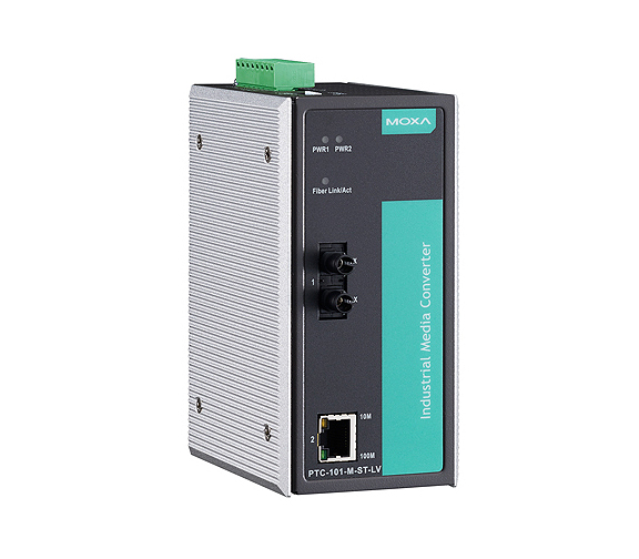Moxa PTC-101-M-ST-HV - Industrial 10/100BaseT(X) to 100BaseFX media converter, multi-mode with ST connector, 1 isolated power su