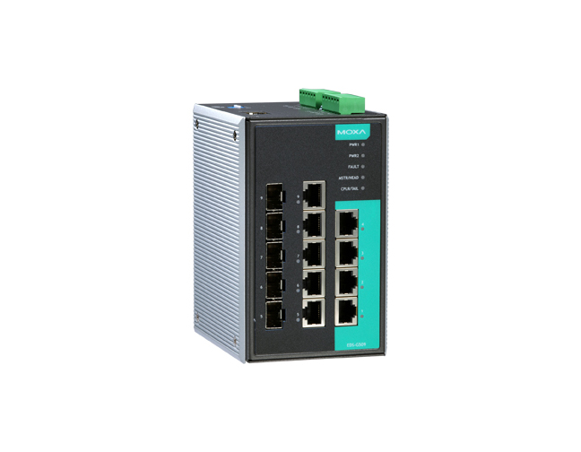 The EDS-G509-T is equipped with 9 Gigabit Ethernet ports and up to 5 fiber optic ports, making it ideal for upgrading an existing network to Gigabit speed or building a new full Gigabit backbone. Gigabit transmission increases bandwidth for higher performance and transfers large amounts of video, voice, and data across a network quickly. Redundant Ethernet Turbo Ring, Turbo Chain, RSTP/STP, and MSTP increase system reliability and the availability of your network backbone. The EDS-G509 series is designed especially for communication demanding applications, such as video and process monitoring, shipbuilding, ITS, and DCS systems, all of which can benefit from a scalable backbone construction.
