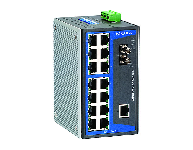 Moxa EDS-316-M-ST - Industrial Unmanaged Ethernet Switch with 15 10/100BaseT(X) ports, 1 multi mode 100BaseFX port, ST connector by MOXA