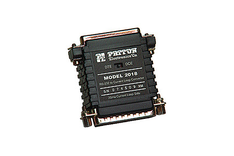 Patton Model 2018M-F is an optically isolated, multi-function RS-232 to 20mA current loop converter: Hook it up to an active 20mA current loop circuit and it's a passive converter. Hook it up to a passive 20mA current loop circuit, add DC power to one of several DB-25 interface pins, and it's an active converter. Connect two units together, supply DC power to one interface, and it's an optically isolated RS-232 distance extender.