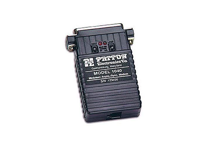 Patton Model 1040UM self-powered miniature short range modem packs the features of Patton's Model 1080 into a package that requires no AC power. Operating asynchronously or synchronously, the Model 1040 supports data rates to 38.4 Kbps and distances to 12 miles (19.3 Km). The Model 1040 will operate over 2 or 4 wires, in point-to-point or multipoint environments. In synchronous mode, the Model 1040 supports Internal, External or Receive loopback clocking.