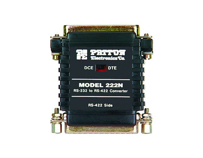 The Patton Model 222NM-RJ11 Series of converters now comes in two "flavors": The Model 222N allows an RS-232 device with DB-25 port to connect to an RS-422 device up to 4000 feet away over two twisted pair. The Model 222N9 does the same thing for an RS-232 device with a DB-9 port (now called EIA-574). Both converters support data rates up to 19.2 kbps, and require no AC power or batteries for operation. All handshaking lines are looped back. The Model 222NRC is a dual rack card version of the Model 222N, with two converters in one card!