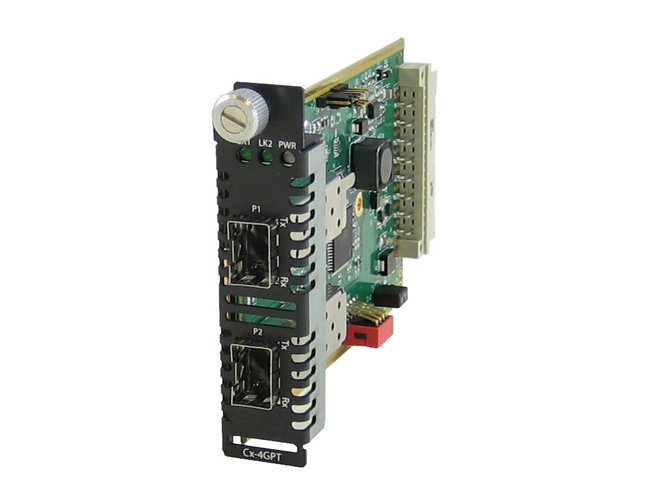 The C-4GPT-DSFP Fiber Mode Converter Module comes with two empty SFP slots. This allows for flexible network configurations using SFP fiber transceivers supplied by Perle, Cisco or other manufacturers of MSA compliant SFPs. Adapting to different fiber types, distances and wavelengths is made simple by mixing and matching SFP’s as needed for maximum flexibility across a variety of topologies and network architectures. The hot-swappable nature of SFPs allow for easy configuration and future upgrades as network demands evolve by simply upgrading a single SFP instead of replacing the entire fiber mode converter.