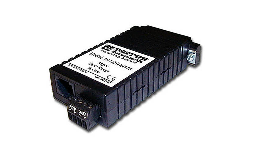 The Patton Model 1012BFR11TB asynchronous short range modem is ideal for multidrop environments or for applications requiring hardware control signals. Attaining DC isolation through custom-designed ferrite core transformers, the Model 1012B operates effectively between buildings. In a point-to-point application, the Model 1012B will operate full or half duplex up to 6 miles (9.7 km). Supporting data rates to 57.6 kbps, the Model 1012B requires no AC power for operation. 600 Watts per wire of Silicon Avalanche Diode surge protection on the line side is now standard.